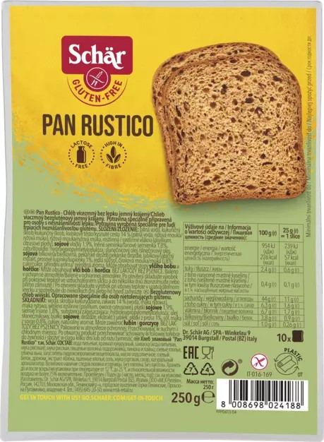 Schär Pan Rustico gluténmentes többmagvas szeletelt kenyér védőgázas csomagolásban. Hőkezelés nélkül azonnal fogyasztható szeletek. Kifejezetten gluténérzékenyek számára készült. Laktóz- és gluténmentes.